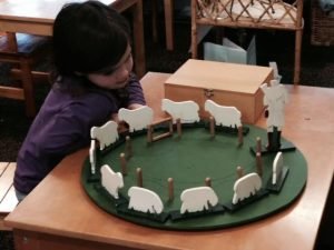 The first encounter in an atrium is one of wonder and perhaps awe. If parents walk in with a child, they like to share their knowledge of what they see, moving into teaching them the names or concepts the adult relates to in the work. Little children first seem to like to touch, to feel what has been prepared for them. They long to know, “Who made this?” They know it is a space for them because everything is just the right height and size for their smaller bodies. In the Catechesis of the Good Shepherd it is the environment that becomes the teacher. The young children learn more from interacting in their environment than through direct instruction. That is why it is so important that the catechist prepares the environment to entice the children to draw nearer to God and to form a loving relationship with Jesus, the Good Shepherd.